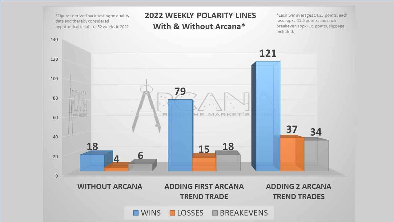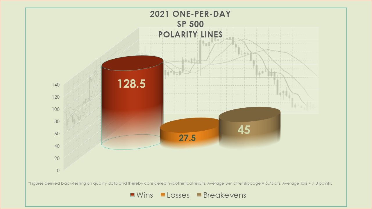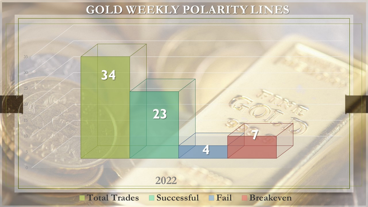 Have you ever seen markets run up or down into an invisible wall? You try in vain to explain the invisible anomaly with a pivot point, moving average, or price support. And once price breaks through, it explodes like a rocket. Chances are You have encountered a “polarity line,” or one of W. D. Gann’s “resistance lines.” The catch- these lines are only visible to the Gann trader. These lines represent hidden forces behind-the-scenes of the market. If a market has enough energy to close above or below a polarity line on the timeframe you are trading, the polarity propels price a predetermined distance. Gann advised simple, objective rules for trading these lines alone or with his other techniques. The placement of each line in advance changes each day, week, month, or year according to a predetermined formula. It is possible to draw lines are drawn YEARS in advance, even for intraday analysis. Trading these lines are ranked according to "best of breed" in our "W. D. GANN: MASTER THE MARKETS" Training. Gann combined Polarity Lines with other Gann techniques and conventional technical analysis. The sky is the limit on their application, because they capture a sound premise causing breakouts. The graph to the right shows Facebook stock's weekly Polarity Line trades for all of 2021 using only the simple first break of the nearest line each week. A preschooler can do this. Of the 52 weeks there are 42 trades, 27 wins, 6 losses, 9 break-evens, and a net $74.40 points. Do you know of any quant programs that can do that? Using only the break of a drawn line? Last year FB printed over $75 dollars net up using just these line breaks. Over the last 4 years it usually does about $39 minimum. Let's up the ante a bit. In the graph below for the Weekly Polarity Lines on the SP 500, we have added the Arcana, or W. D. Gann's trend prediction technique as a directional trade filter. The graph breaks down the trading 3 ways: (1) Only taking the first break of the nearest line to price limited to one trade per week; (2) Dividing the week into zones based on Arcana trends or trendless zones, and taking only the first line break of each zone only in the direction of Arcana trend; and (3) Same as #2 above but taking only the first 2 line breaks in each trend zone. Gann offered options like these to his students based on their appetite for complexity. Note that each "win" in the graph represents 14.25 points on the SP 500 after slippage applied to diminish each win and exaggerate each loss and breakeven. By taking only one line break alone per week, these Polarity Lines have yielded between 90 and 220 points each year on the weekly SP 500 for the past 6 years, but as you can see they are far more potent adding Gann's Arcana as a trade filter. Of course, these lines also work on an intraday basis. Slippage is more of a factor on intraday markets using these lines. The key is to find a very liquid and active market to compensate, usually a stock. Click on the graphs below to see expanded results and test criteria on intraday performance on the SP 500. Scroll through the gallery below for gold weekly futures polarity lines. This technique and data set is confined to New York equities session. Only 3 losses in all of 2021! Each target and stop is approximately $10. Executable on GLD etf and options as well as futures. Contact us for more information about the above techniques, or if you would like stats on the market and timeframe you trade.