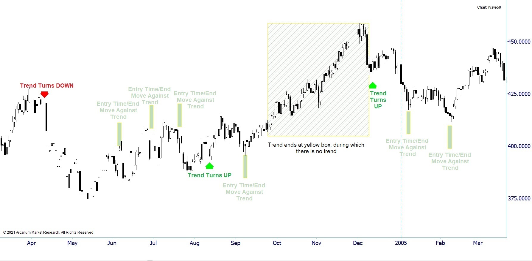 Contact us for to see our back-testing log detailing the last 82 years (220 consecutive trend leg occurrences) of each trend leg of the Annual Arcana with consistent, objective rules predicting the direction and duration of each trend leg. The unfiltered result: 84% cumulative for all 80 years; 89% for the last 40 years.