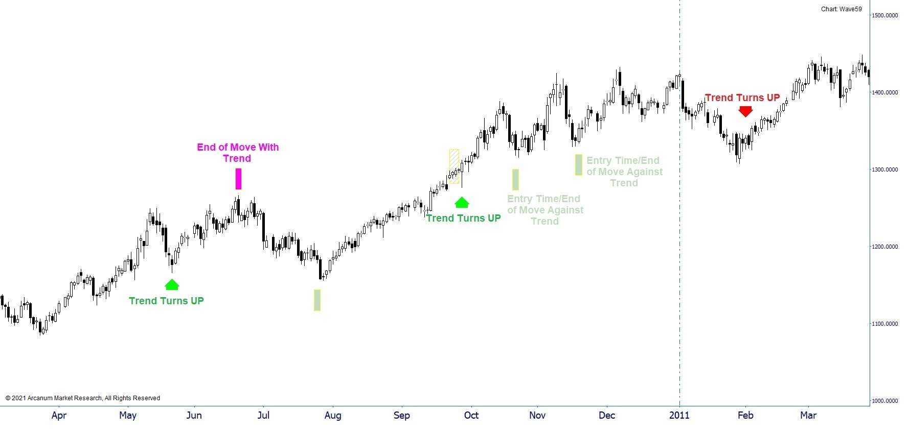 Contact us for to see our back-testing log detailing the last 82 years (220 consecutive trend leg occurrences) of each trend leg of the Annual Arcana with consistent, objective rules predicting the direction and duration of each trend leg. The unfiltered result: 84% cumulative for all 80 years; 89% for the last 40 years.