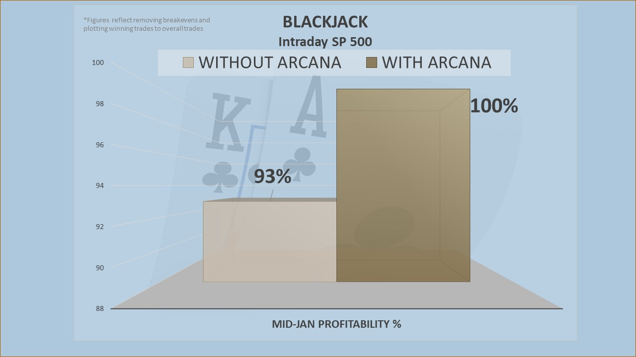 Each target expectation averages around 7 points per trade. Results shown use Arcana as a long/short filter for reversals and secondary line breaks. Arcana may also be used as a filter for the primary trade. This gives us more trade efficiency, but overall slightly less profit. Blackjack, along with the Gann methods its based upon, is taught in its entirety in our "W. D. GANN: MASTER THE MARKETS" Training.